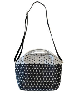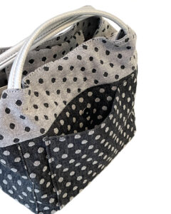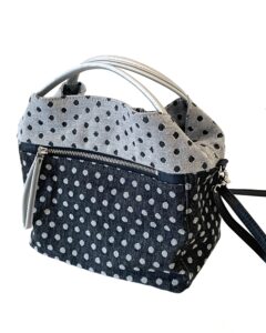 綿100%のクロのデニム 最大の特徴は「膨れ織(ふくれおり)」という特殊な織り方です。この織りの生地の表と裏を効果的に使用することで、水玉の模様が単なるプリントではなく、まるで彫刻のような立体感を持って表現されています。この技法により、柄に深みと独特な表情が生まれています。